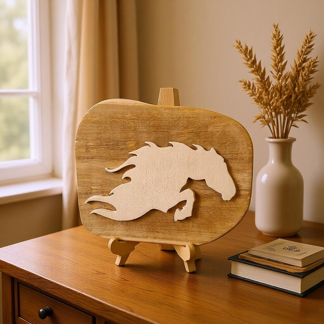 Cheval Eclair découpé dans du peuplier et posé sur du teck